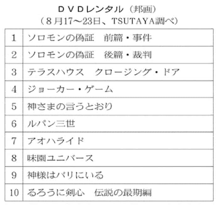 Tsutaya レンタルdvdランキング ソロモンの偽証 は前後篇で2位3位ランクイン テラスハウス劇場版もレンタル開始 Tsutaya ツタヤ