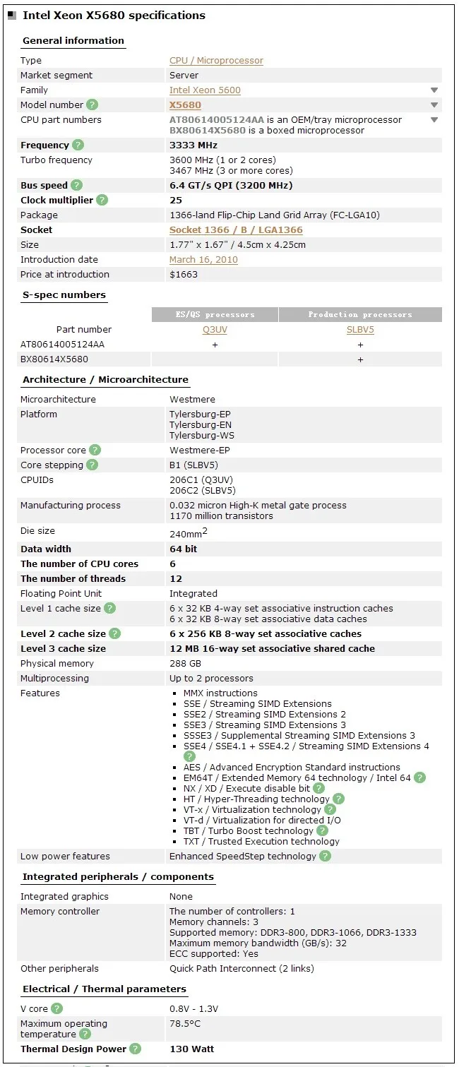 Intel Xeon X5680 3 33ghz 12mb Slbv5 6 Core 6 40gt S Lga1366 Cpu Processor